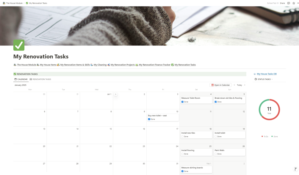 • use the Renovation Tasks database to further detail your renovation projects into tasks
