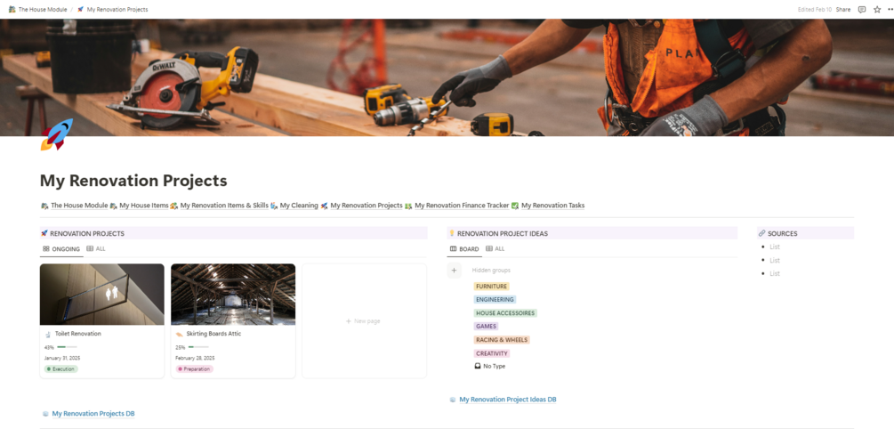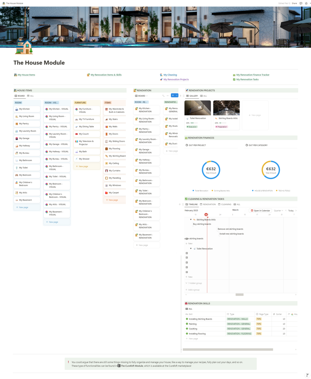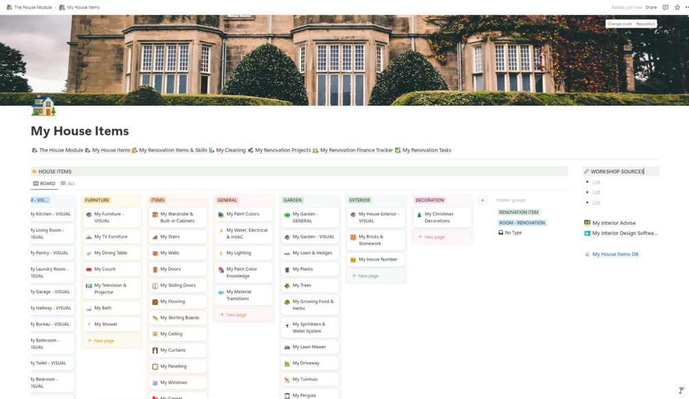 • use the House Items database to store all design inspiration, tips, moodboards, renovation knowledge, furniture, neatly sorted per room, house element, system,…