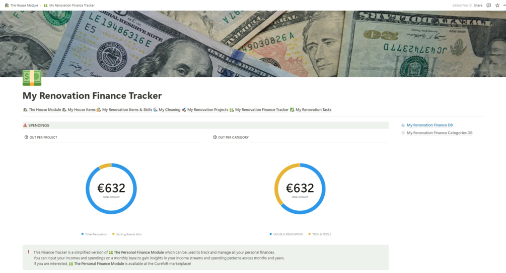 • use the Renovation Finance database to keep track of all your spendings and incomes related to your house and your renovation projects