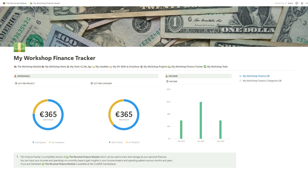 • use the Workshop Finance database to keep track of all your spendings and incomes related to your workshop and your projects